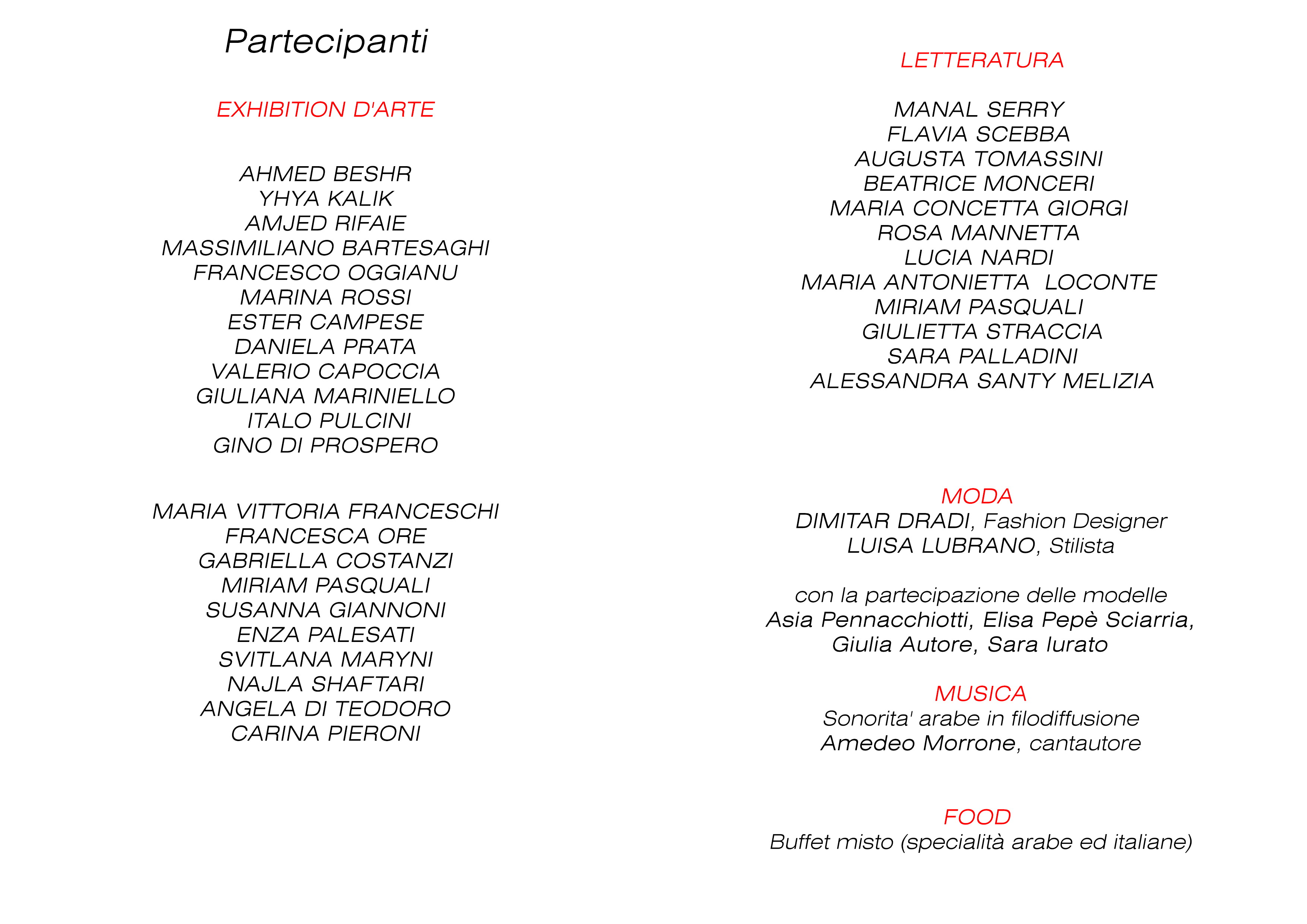Per l’argomento Arte, si inaugurerà una collettiva di pittura, fotografia, scultura. Gli artisti che hanno accettato l’invito sono, in ordine casuale: Ahmed Beshr, Yhya Kalik, Amjed Rifaie (che eseguirà durante l’evento anche una performance di calligrafia araba), Massimiliano Bartesaghi, Francesco Oggianu, Marina Rossi, Ester Campese, Daniela Prata, Valerio Capoccia, Giuliana Mariniello, Gino Di Prospero, Maria Vittoria Franceschi, Francesca Ore, Gabriella Costanzi, Miriam Pasquali, Susanna Giannoni, Enza Palesati, Svitlana Maryni, Najla Shaftari, Angelo Di Teodoro, Carina Pieroni, Italo Pulcini.