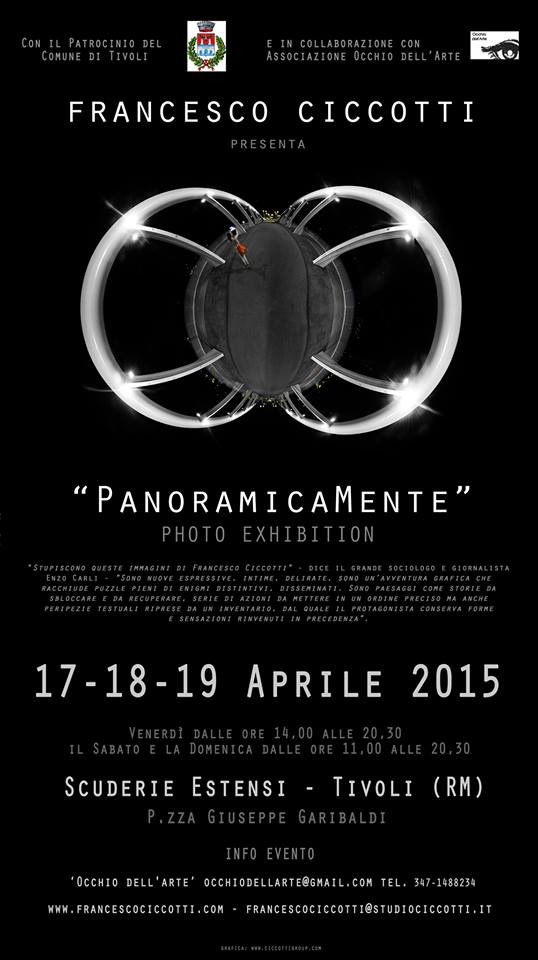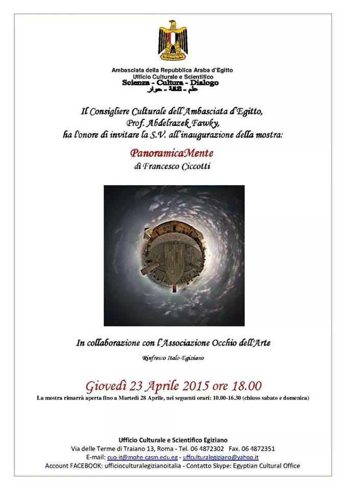 In occasione della tappa “PanoramicaMente” del Fotografo-Architetto italiano Francesco Ciccotti che verra' inaugurata a Roma, presso l'Istituto Culturale dell'Ambasciata Araba d'Egitto, il prossimo 23 Aprile, oltre a presentare gran parte del progetto fotografico appartenente a questa fantastica serie, composta nel complesso di una quarantina di opere in medio e grande formato, verra’ mostrata al pubblico per la seconda volta l’opera denominata “Eclipse”, la cui realizzazione è stata effettuata durante la recente eclissi di sole del 20 marzo scorso.